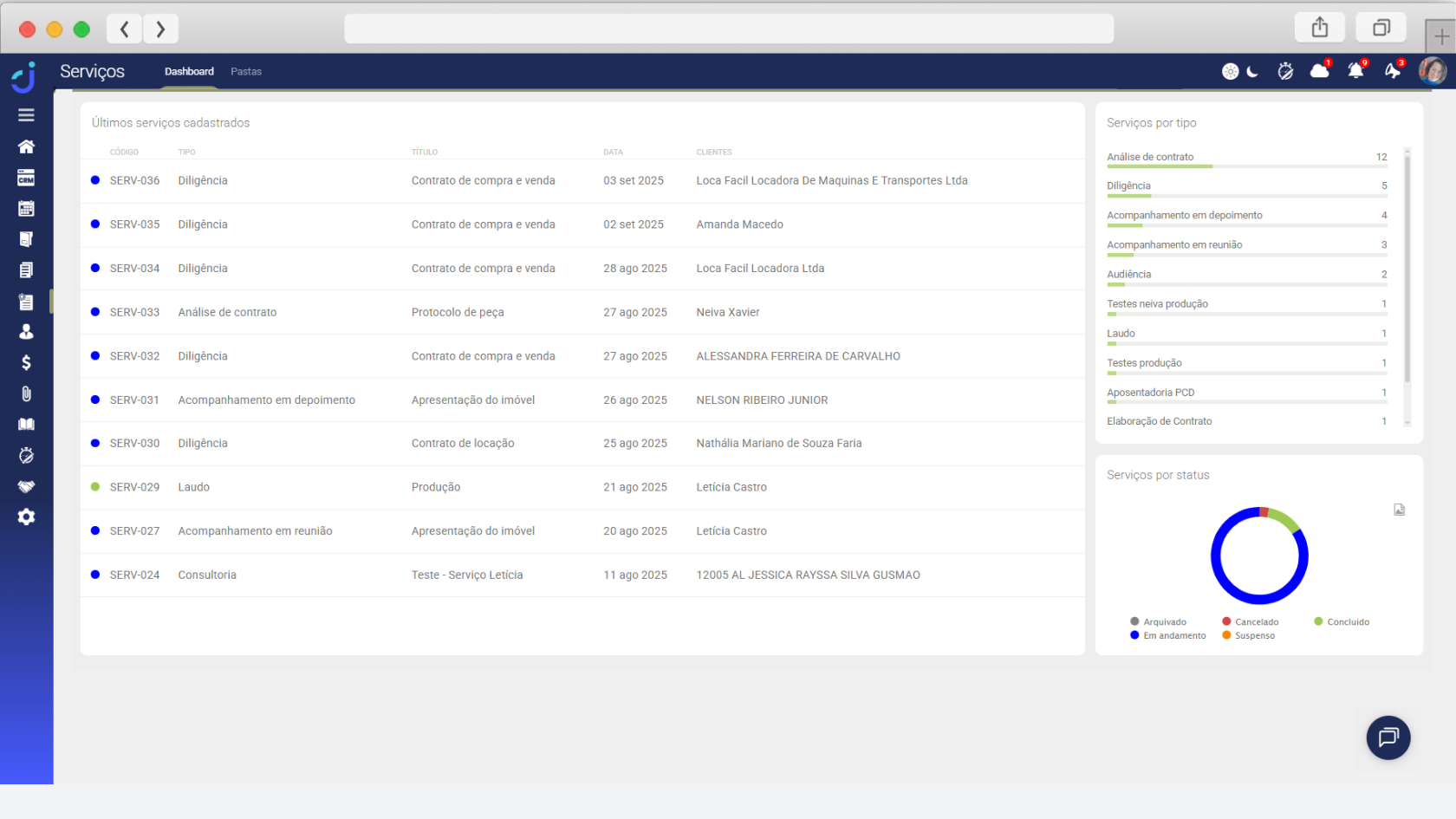 - Gerenciamento completo das pastas de serviços do escritório;